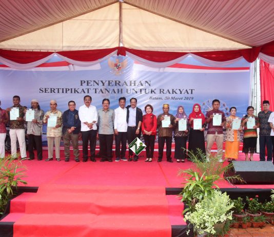 HUMAS PEMKO BATAM- Sebanyak 20 ribu sertifikat tanah masyarakat Kota Batam dibagikan di Dataran Engku Putri, Sabtu (30/3). Pembagian sertifikat dihadiri langsung oleh Menteri Agraria dan Tata Ruang (ATR), Sofyan A Djalil. Penyerahan sertifikat ini dihadiri Walikota Batam, Muhammad Rudi, Wakil Walikota Batam dan Gubernur Provinsi Kepri, Nurdin Basirun.