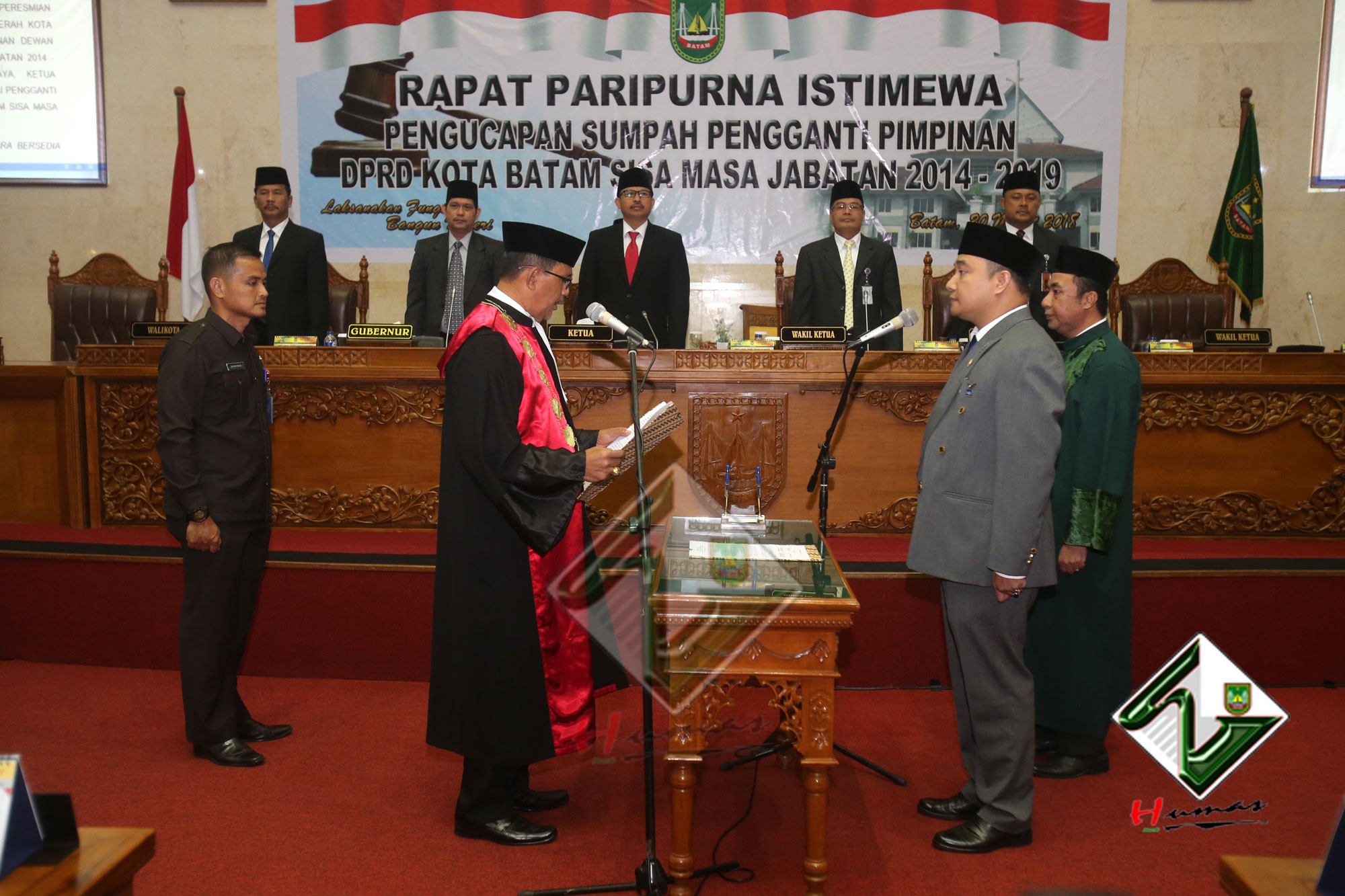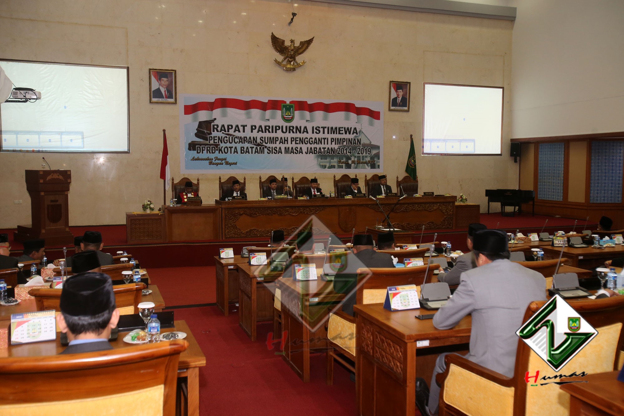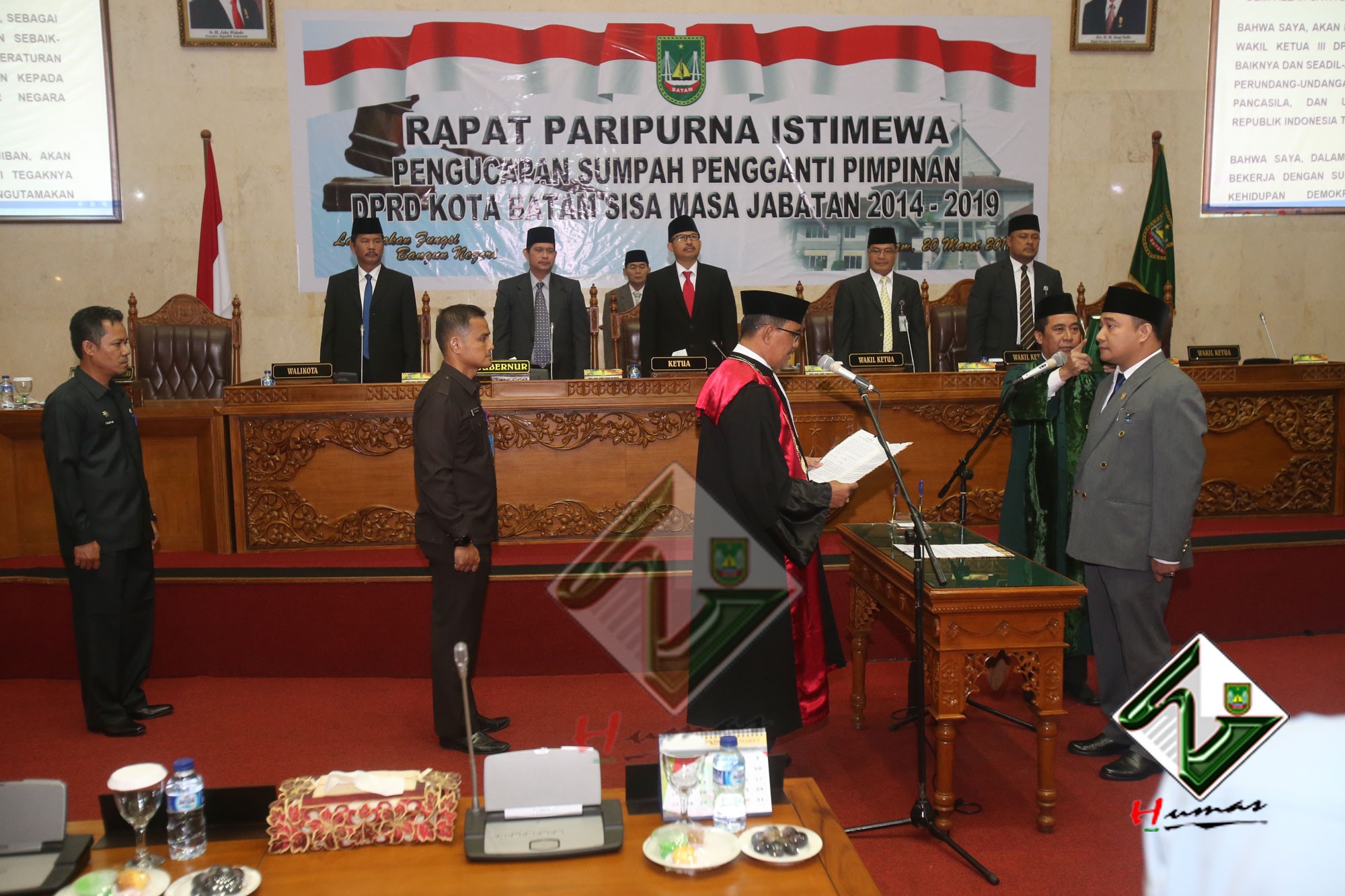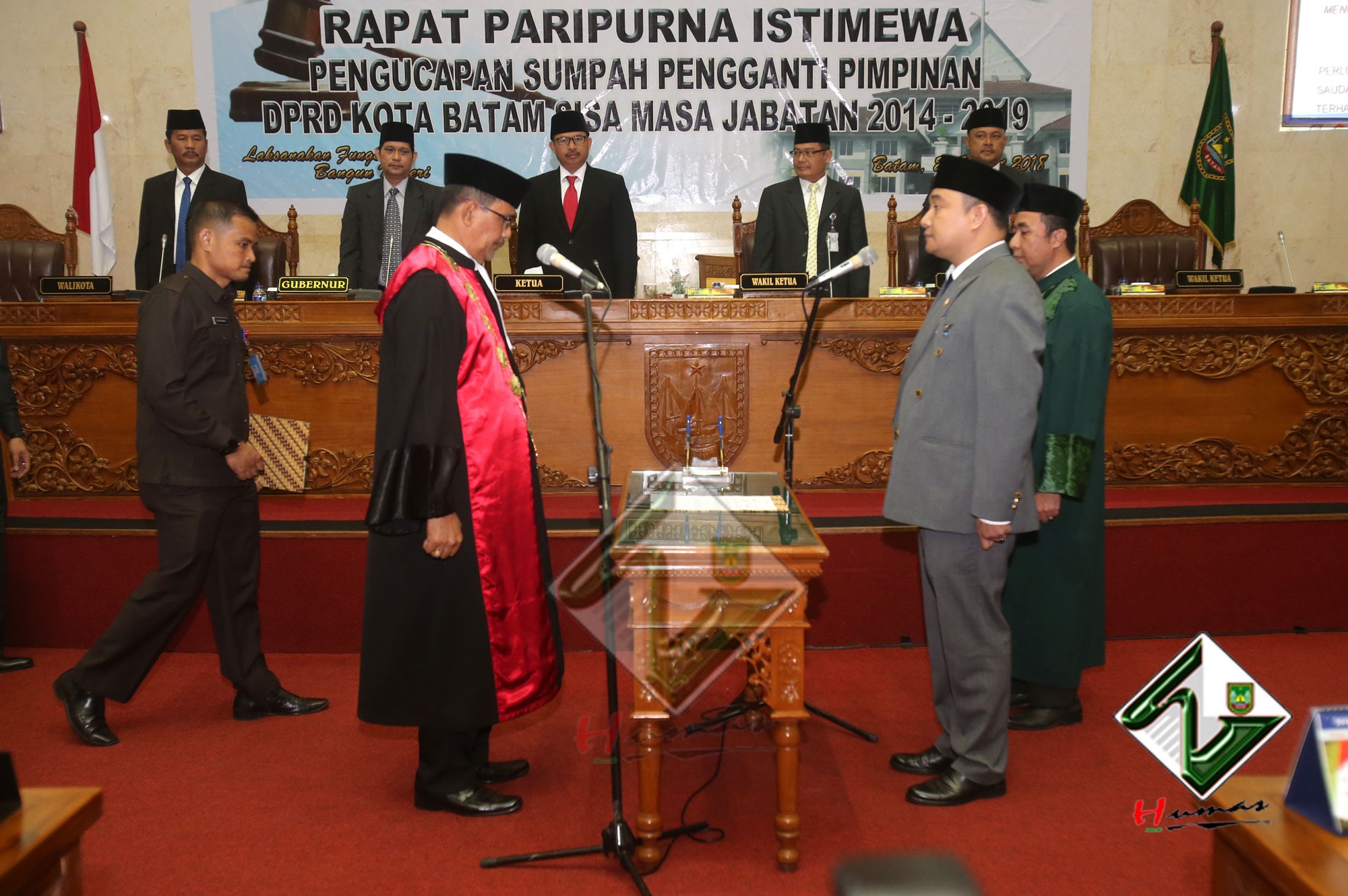 HUMAS PEMKO BATAM– Wali Kota Batam, Muhammad Rudi bersama dengan Wakil Wali Kota (Wawako) Batam, Amsakar Achmad menghadiri Rapat Paripurna Istimewa DPRD Kota Batam dengan agenda Pengucapan Sumpah Pengganti Pimpinan DPRD Kota Batam sisa masa jabatan 2014-2019, Selasa (20/3). Dalam Rapat Paripurna Istimewa, Tengku Hamzah Husein sebelumnya menjabat sebagai Wakil Ketua III DPRD Kota Batam digantikan oleh Helmy Hemilton. Pengucapan sumpah dipimpin langsung oleh Ketua Pengadilan Negeri Batam, Syahlan.