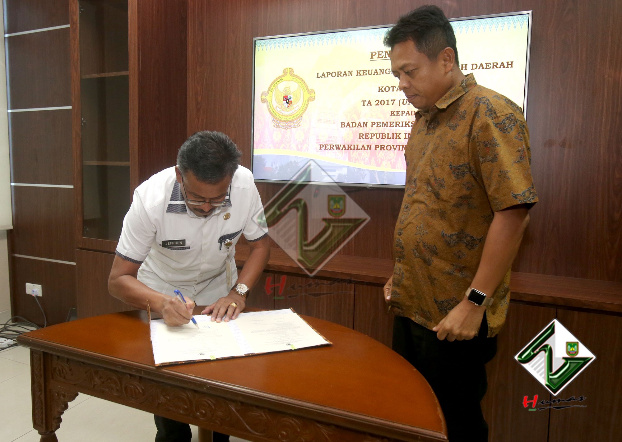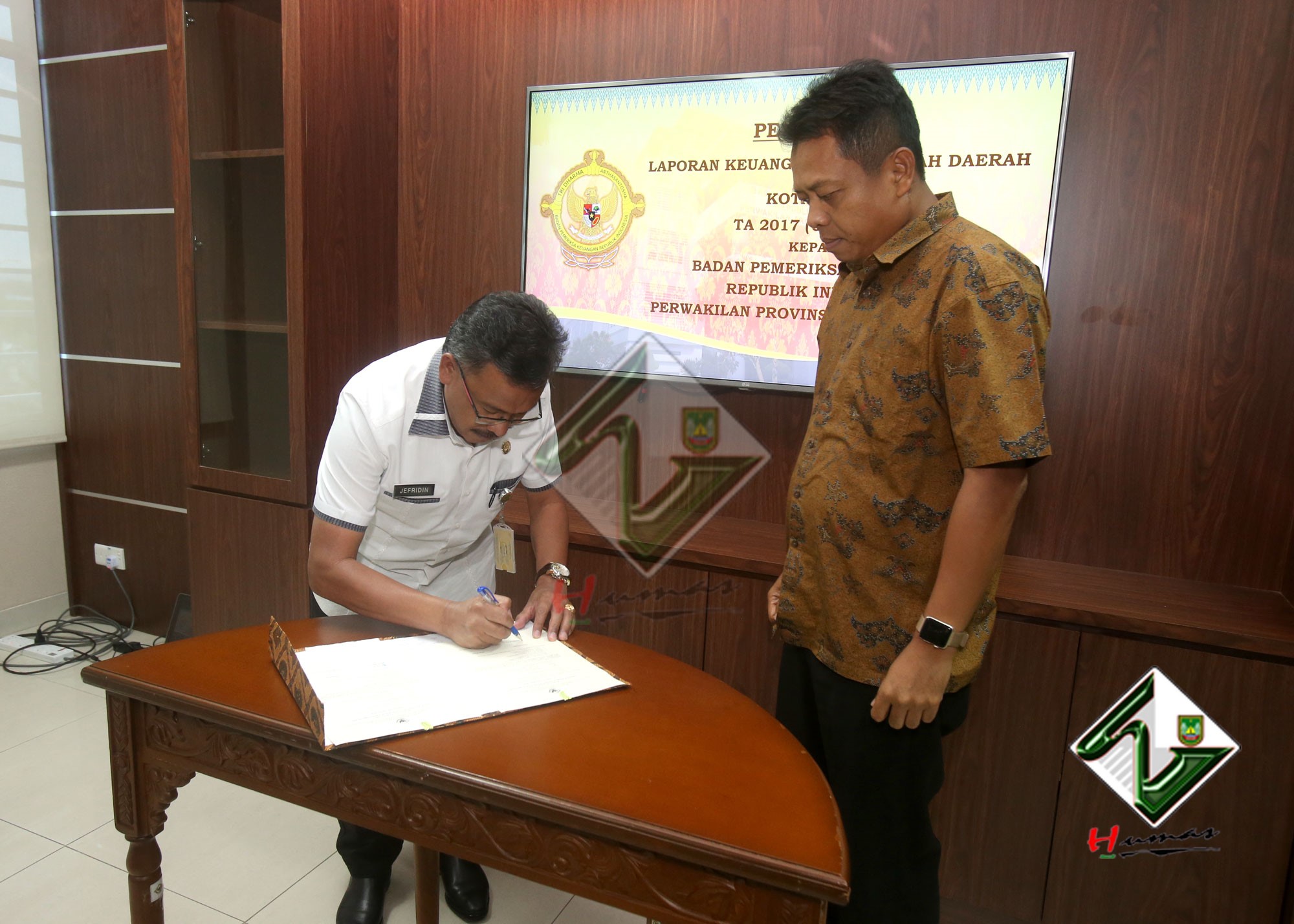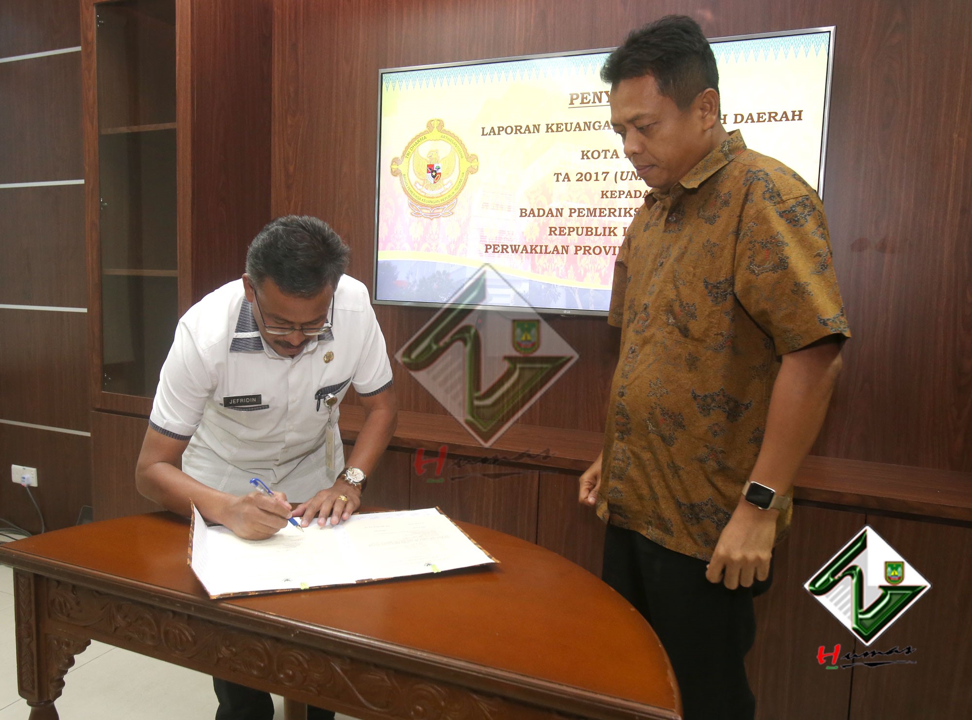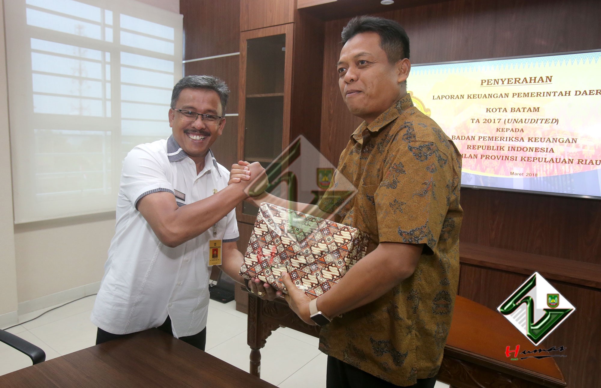 HUMAS PEMKO BATAM– Wali Kota Batam, Muhammad Rudi melalui Sekretaris Daearah Kota Batam, Jefridin menyerahkan Laporan Keuangan Pemerintah Kota (Pemko) Batam Tahun 2017 Kepada BPK RI Perwakilan Provinsi Kepri, Selasa (27/3). Penyerahan itu ditandai dengan penandatanganan berita acara serah terima antara Sekda dengan Kepala BPK RI Perwakilan Kepri, Joko Agus Setyono.