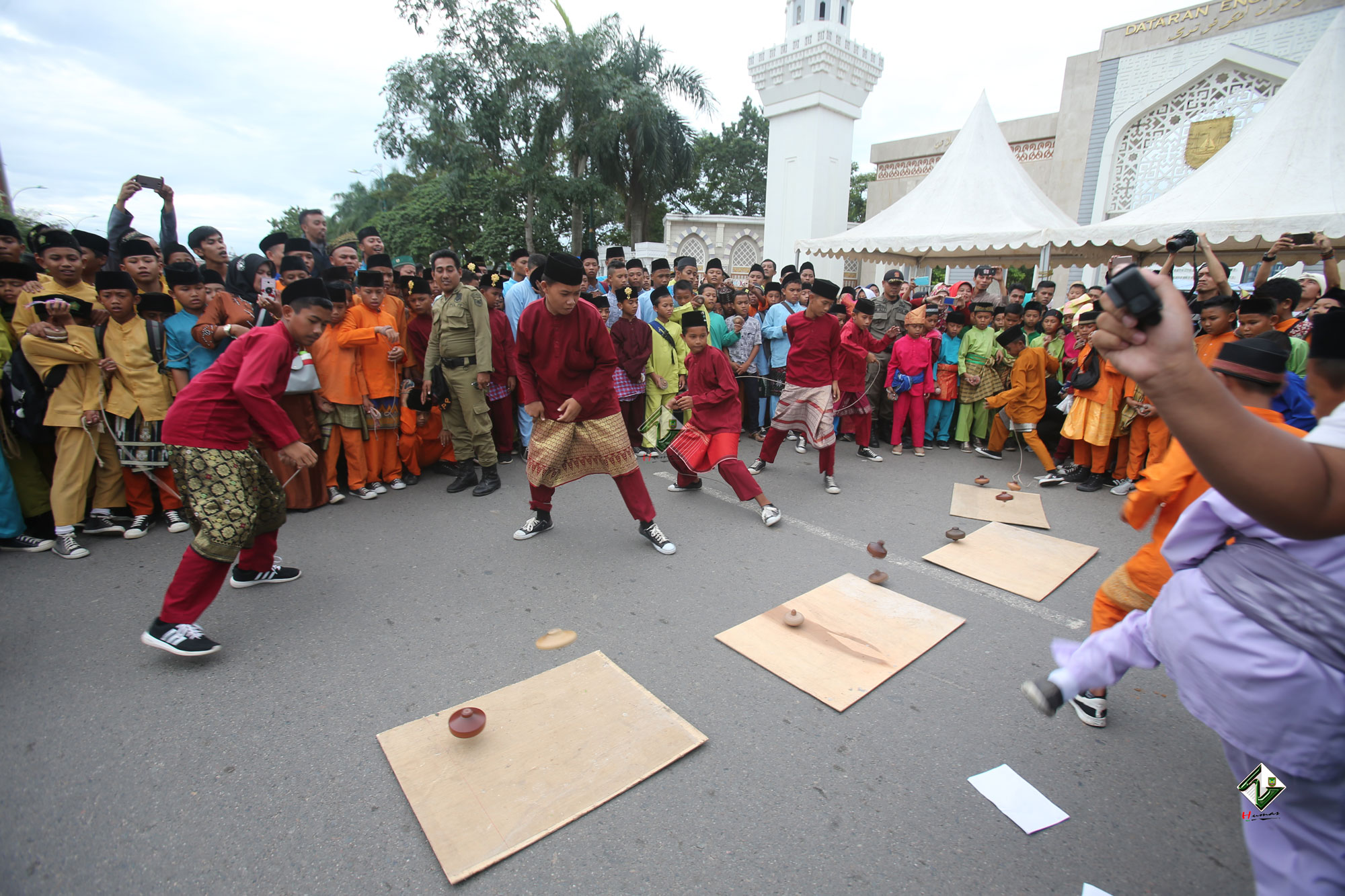HUMAS PEMKO BATAM – Siswa SD dan SLTP se Kota Batam berkumpul di sepanjang Jalan Engku Putri, Jumat (2/11). Mereka bersiap untuk memutar gasing di sepanjang jalan depan Kantor Walikota. Kegiatan tersebut merupakan rangkaian acara Kenduri Seni Melayu (KSM) Ke-20 Tahun 2018. Sebelum seribu gasing diputar serentak, pemutaran gasing diawali penampilan grup gasing dari Kecamatan Belakang Padang.